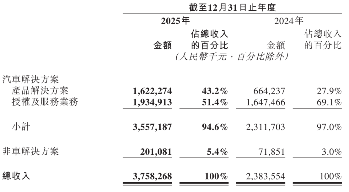 地平线收入分为汽车解决方案和非车收入方案两部分,地平线2025年汽车解决方案收入为35.57亿元,较上年同期的23.12亿元增长53.9%,占营收的比例为94.6%。