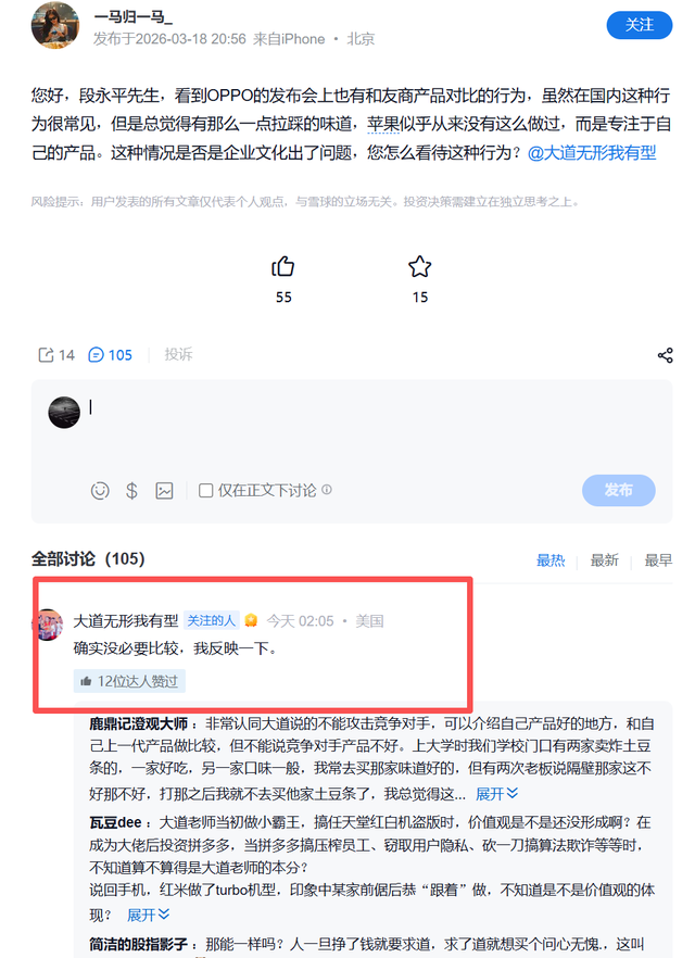 对此,OPPO孵化人段永平前天在雪球平台(@大道无形我有型)发文回应称:“确实没必要比较,我反映一下”。