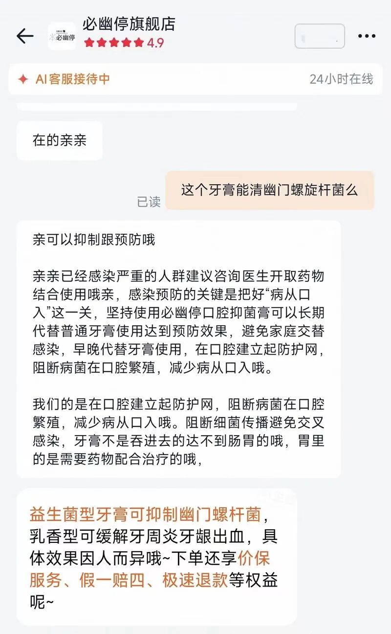 必幽停旗舰店客服宣称其产品可抑制幽门螺杆菌。 电商截图