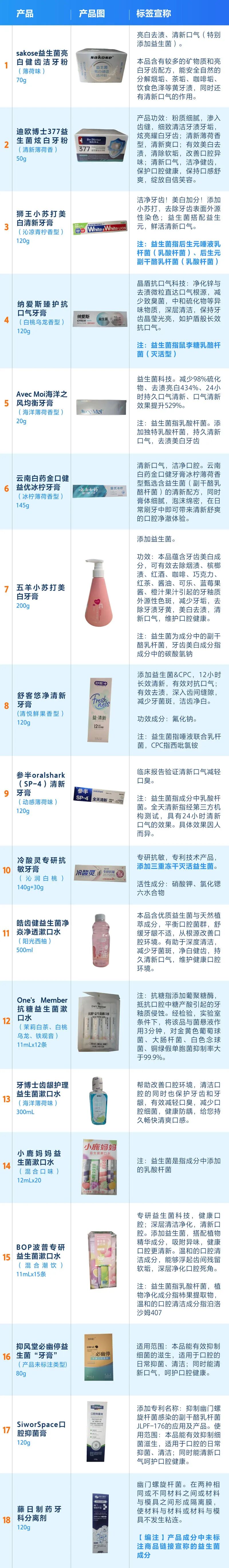 18款样本中,除狮王小苏打美白清新牙膏标注“益生菌AP-32”、SiworSpace口腔抑菌膏标注“副干酪乳杆菌JLPF-176”外,其他产品仅笼统标注益生菌或副干酪乳酪杆菌等成分。