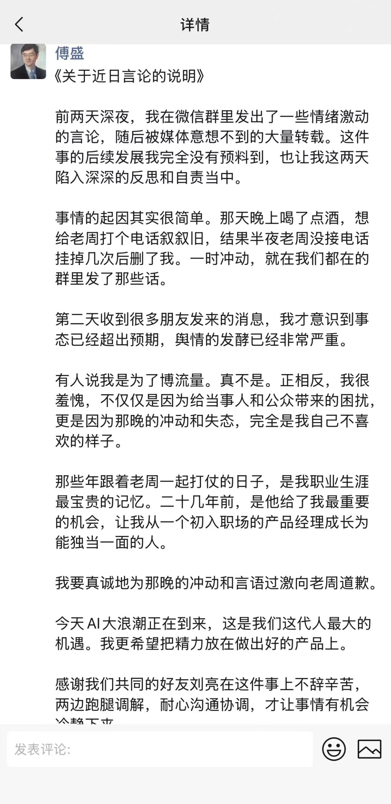 DoNews3月24日消息,猎豹移动董事长傅盛今日凌晨在微信朋友圈发布《关于近日言论的说明》表示:“前两天深夜,我在微信群里发出了一些情绪激动的言论,随后被媒体意想不到的大量转载,这件事的后续发展我完全没有预料到,也让我这两天陷入深深的反思和自责当中。”