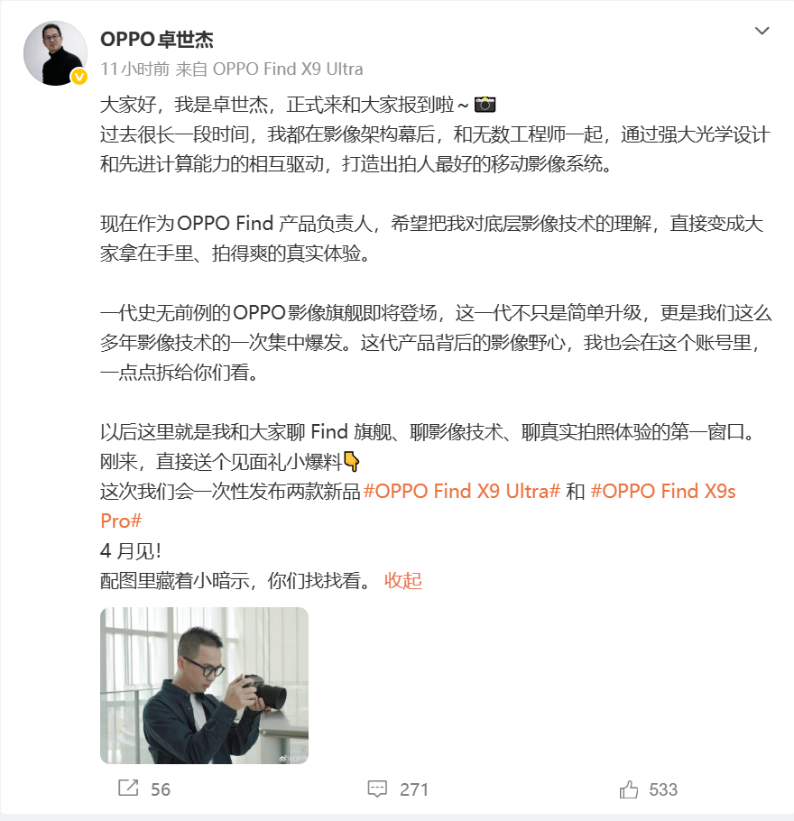 周意保特别提及,即将于4月亮相的Find X系列影像旗舰是他「最骄傲、最用心的一代作品」,并透露卓世杰将与他共同站台,未来作为Find旗舰官方发言人持续输出产品技术解析、核心参数及独家干货。