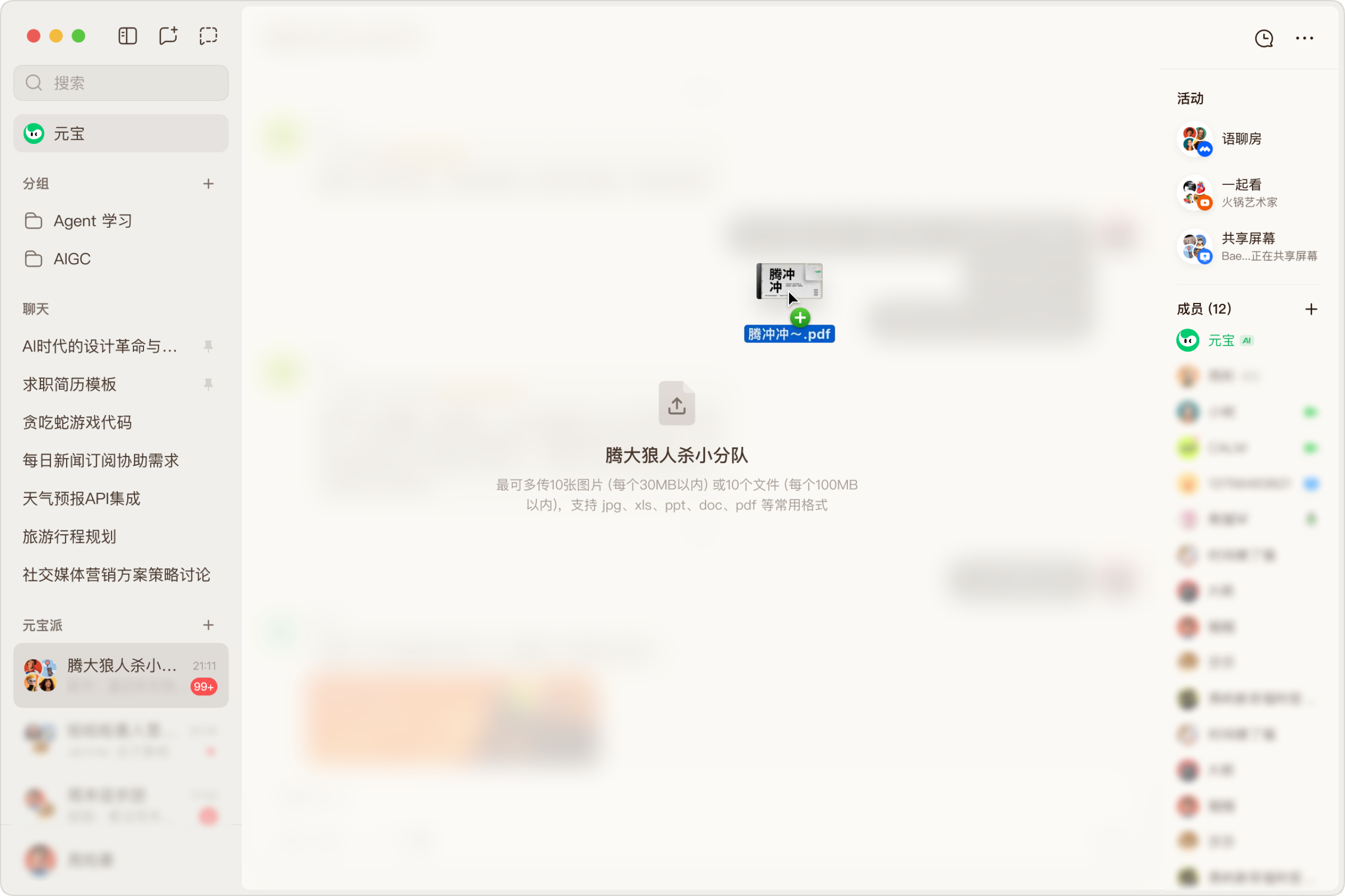 在电脑端,元宝派也带来了更顺手的办公体验:可以边共享屏幕边实时交流,同时支持拖拽上传、截图、多端同步功能,让信息在派里直接流转。