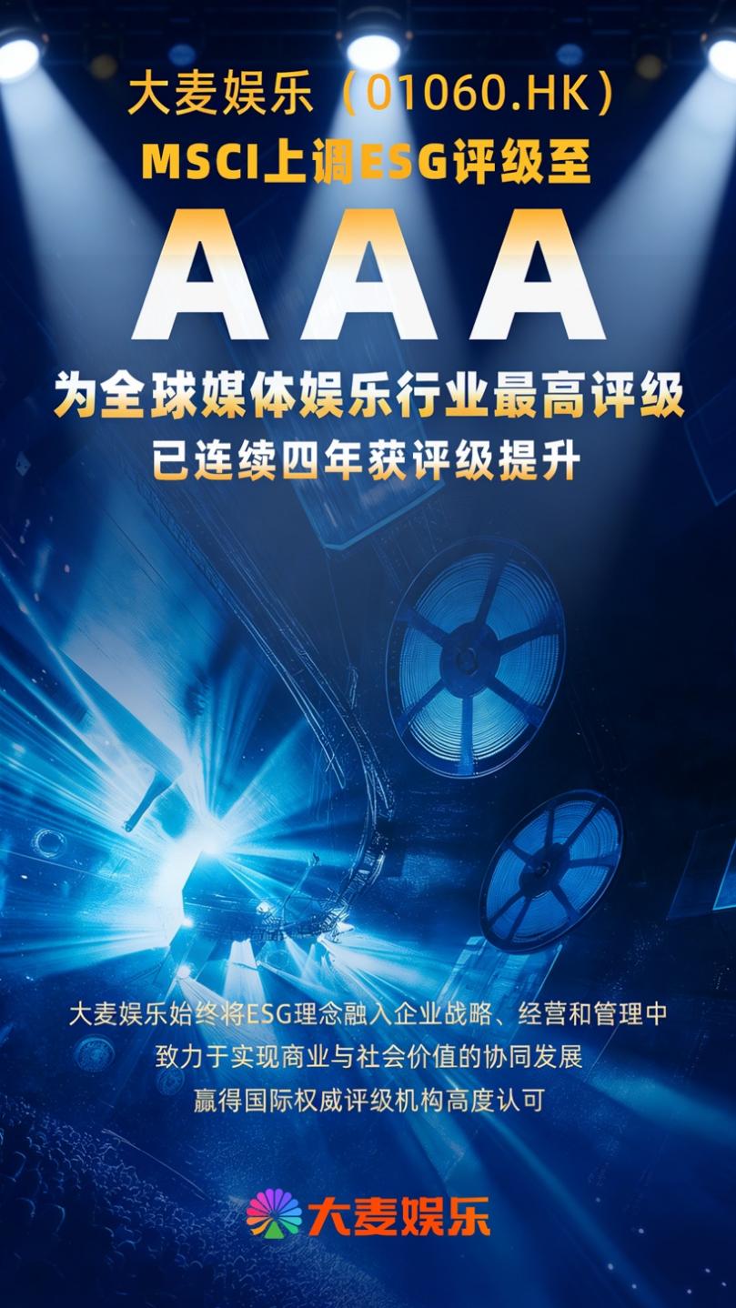 近日,国际权威指数机构MSCI(Morgan Stanley Capital International,摩根士丹利资本国际公司)公布最新环境、社会及管治(ESG)评级结果。凭借在ESG领域的积极履责和创新实践,大麦娱乐的MSCI ESG评级从AA级上调至AAA级,实现连续四年评级跃升,成为目前全球媒体娱乐行业评级最高的企业。