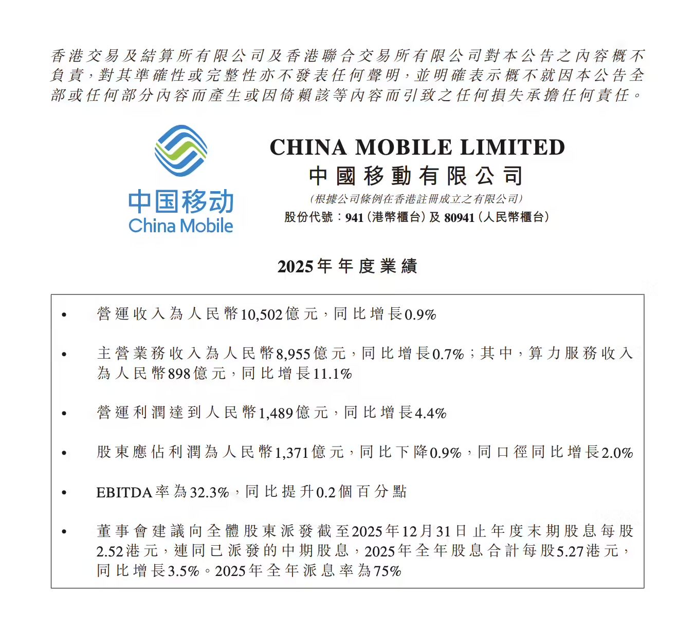 DoNews3月26日消息,中国移动在港交所公告,2025 年营运收入为人民币 10502 亿元,同比增长 0.9%。主营业务收入为人民币 8955 亿元,同比增长 0.7%。