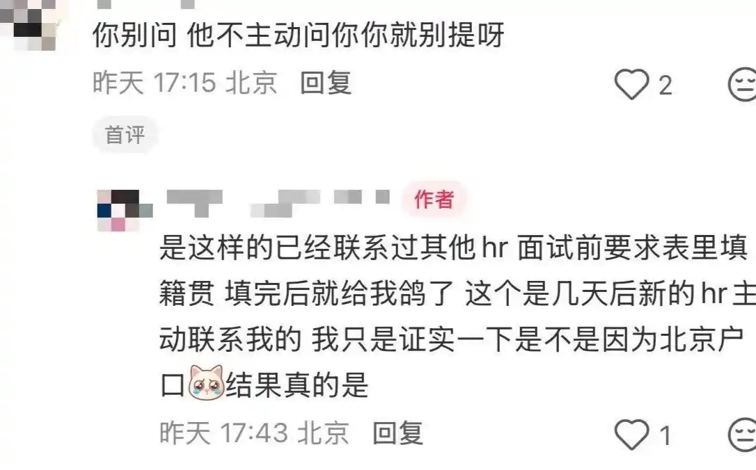 她回忆,此前联系的多位味多美HR起初沟通顺畅,在得知其北京户籍后便突然失联,直到有新HR联系她,她主动询问才得到“不考虑北京本地人”的明确答复,更让她意外的是,公司竟在面试意向填报环节就以户籍决定是否安排面试,这种操作是她求职以来从未遇到过的。
