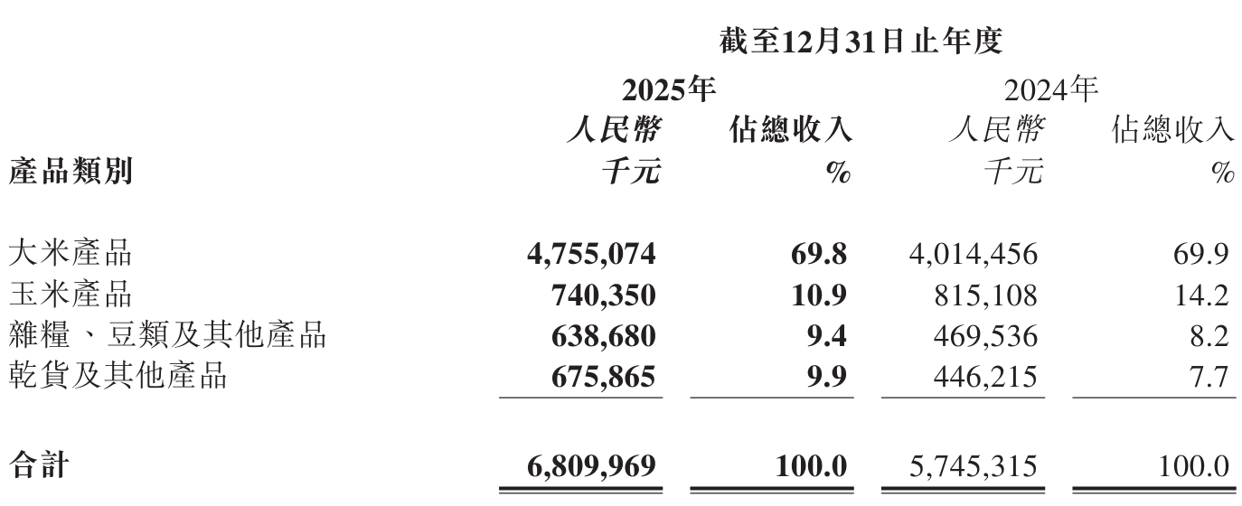 十月稻田2025年来自大米产品收入为47.55亿元,占比为69.8%;来自玉米产品的收入为7.4亿元,占比为10.9%;来自杂粮、豆类及其他产品收入为6.39亿元,占比为9.4%。
