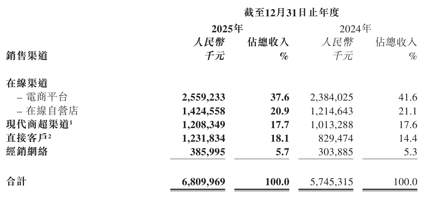 从渠道来看,十月稻田 2025年来自电商渠道的收入为25.59亿元,占比为37.6%;在线自营店收入为14.25亿元,占比为20.9%;现代商超渠道收入为12亿元,占比为17.7%。