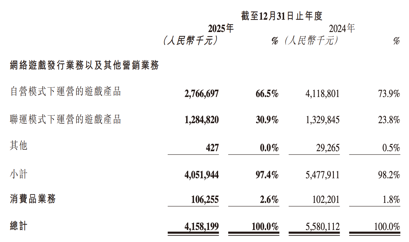 针对公司总营收下滑的主要原因在于自营游戏收入大幅减少。财报显示,2025年自运营游戏收入为27.67亿元,较2024年的41.19亿元下降32.83%。