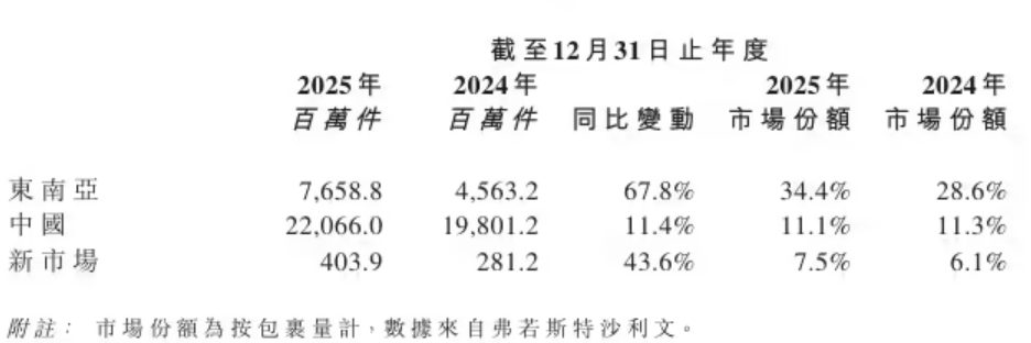 2025 年,公司在东南亚处理包裹量 76.6 亿件,同比增长 67.8%。同期在中国处理包裹量 220.7 亿件,同比增长 11.4%。以包裹量计算,公司在中国市场份额为 11.1%,2024 年可比口径市场份额为 11.3%。