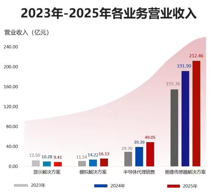 2025 年公司半导体设计业务中,图像传感器解决方案业务实现营业收入 212.46 亿元,占主营业务收入的比例为 73.73%,较上年增加 10.71%;公司显示解决方案业务实现营业收入 9.41 亿元,占主营业务收入的比例为 3.27%,较上年减少 8.47%;公司模拟解决方案业务实现营业收入 16.13 亿元,占主营业务收入的比例 5.60%,较上年增加 13.43%。