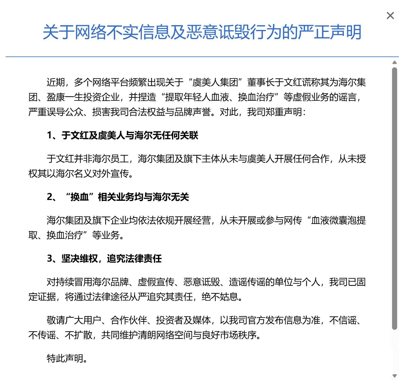 此外,海尔金控强调海尔集团及旗下企业均依法依规开展经营,从未开展或参与网传“血液微囊泡提取、换血治疗”等业务。