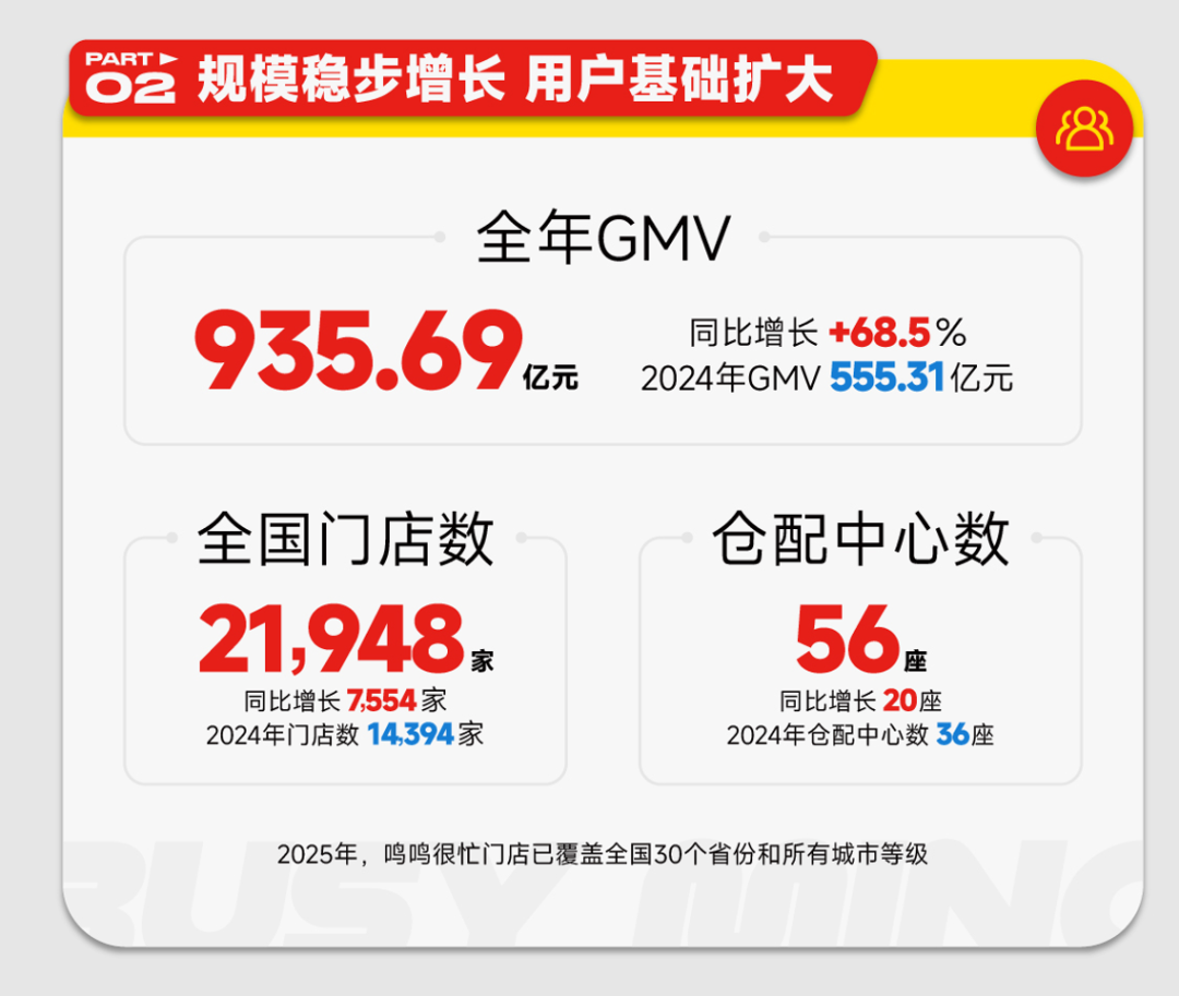 截至2025年12月31日,鸣鸣很忙的门店网络已覆盖1,401个县,截至同日,在中国所有县城中覆盖率达到约75.0%。截至2024年12月31日止年度及截至2025年12月31日止年度,鸣鸣很忙的门店网络中门店的GMV总额为555.31亿元及935.69亿元。