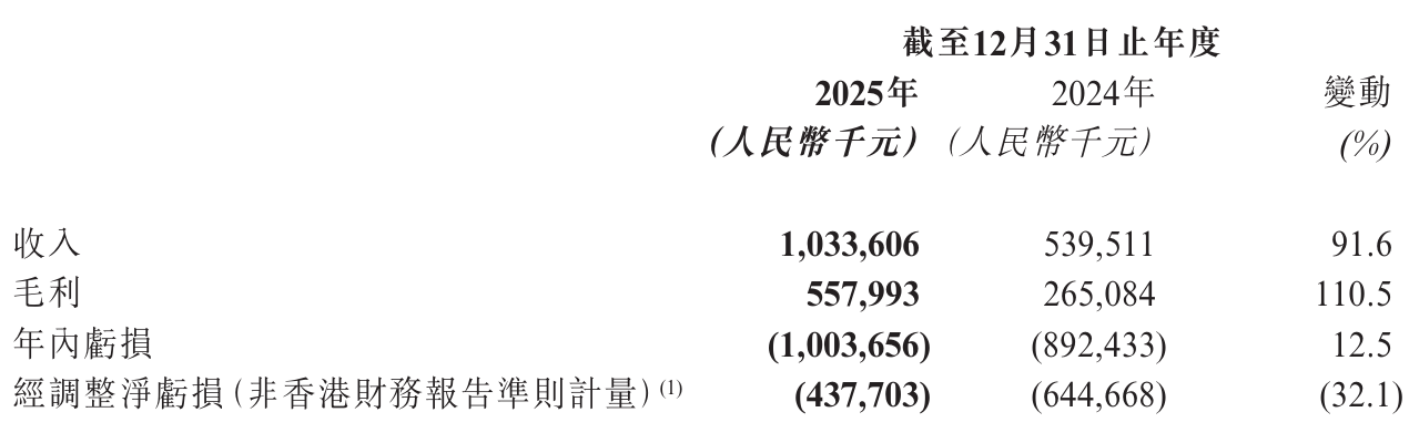 天数智芯2025年来自AI算力解决方案收入为9607万元,占比为9.3%。天数智芯2025年毛利为5.58亿元,较上年同期的2.65亿元增长110.5%。天数智芯2025年年内亏损为10亿元,较上年同期的年内亏损8.92亿元扩大12.5%;经调整净亏损为4.38亿元,较上年同期的6.45亿元收窄32.1%。