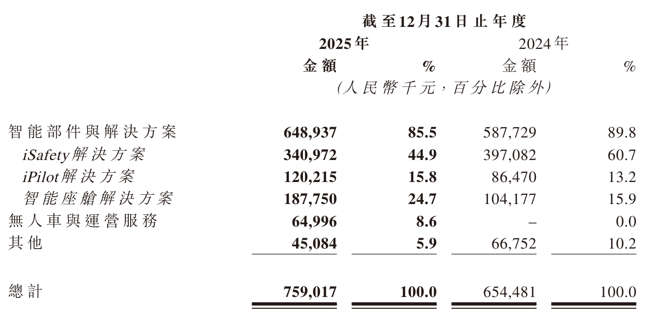佑驾创新2025年智能部件与解决方案业务收入为6.49亿元,占总收入比重约85.5%。其中,iSafety智能辅助驾驶收入为3.41亿元,较上年同期的4亿元下降25%;iPilot中高阶辅助驾驶收入为1.20亿元,同比增长39.0%;佑驾创新2025年智能座舱解决方案实现营收1.88亿元,较上年同期的1.04亿元增长80.2%,成为拉动公司业务增长的重要引擎。