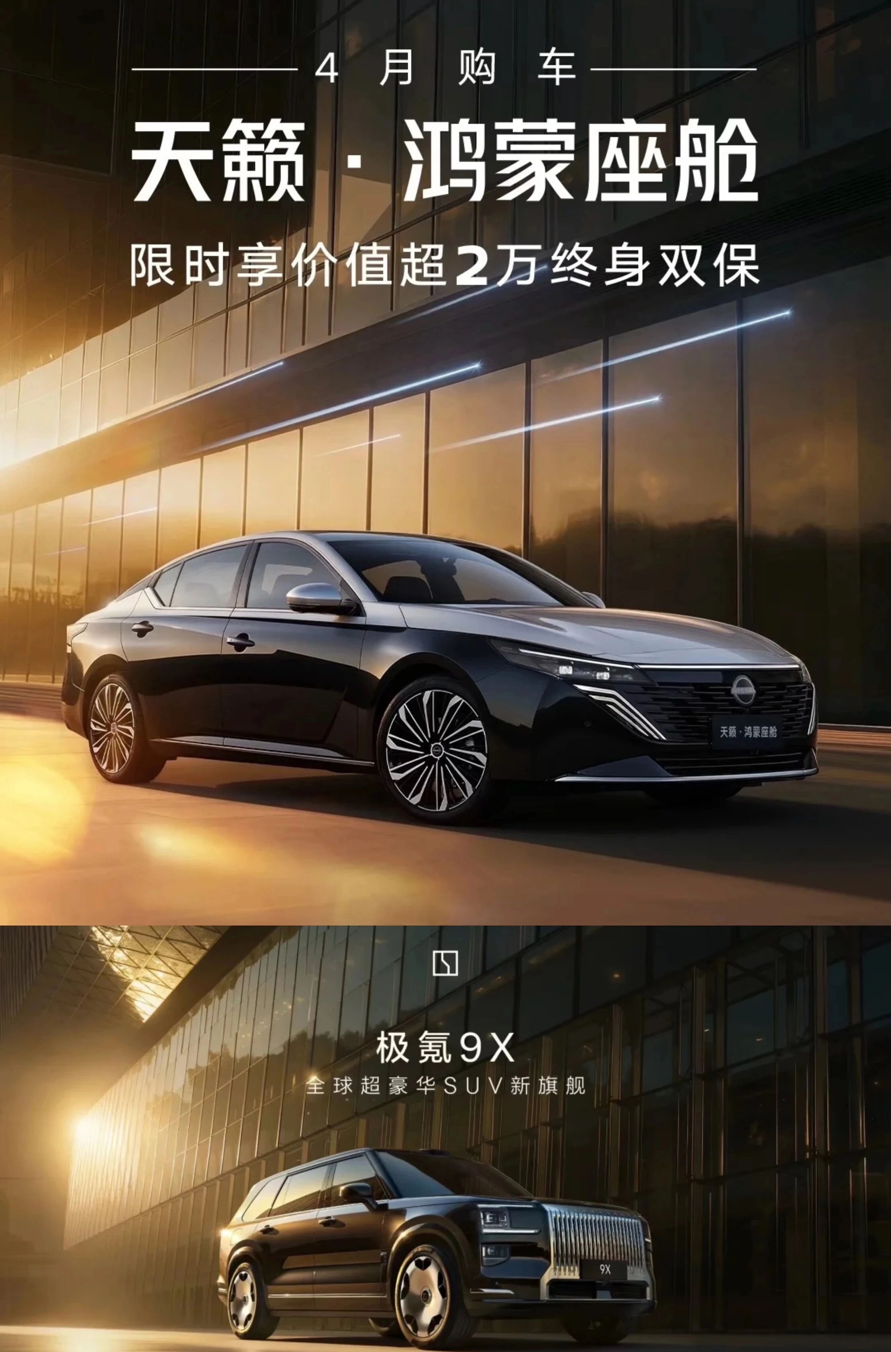 此外,东风日产的“天籁·鸿蒙座舱 S380大师版”也抄袭了自己为极氪9X制作的广告创意。对比图显示,两张广告图均以现代化玻璃幕墙为背景,光线均为暖黄色的侧逆光,画面左侧有明显的阳光光晕。