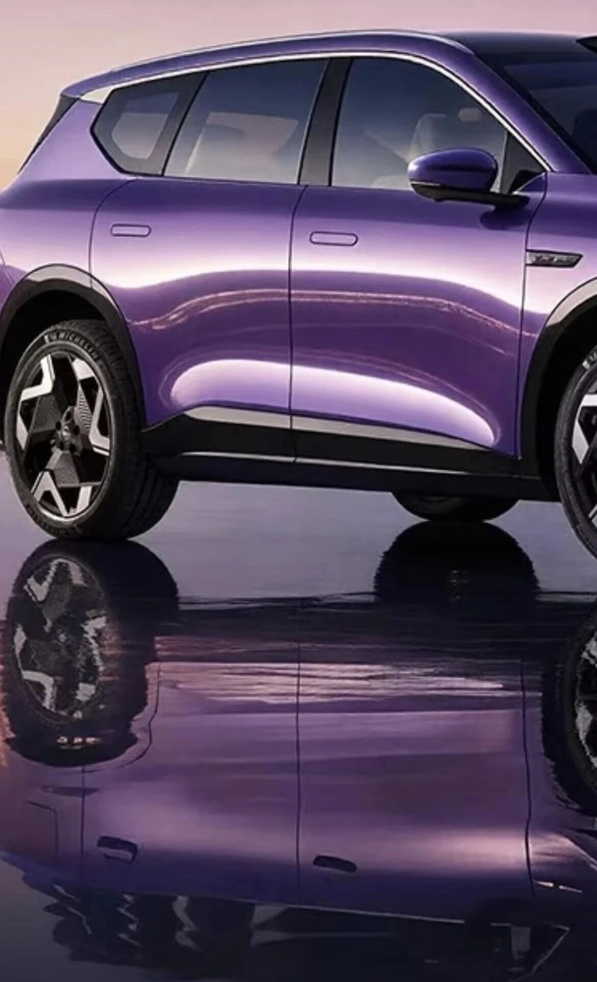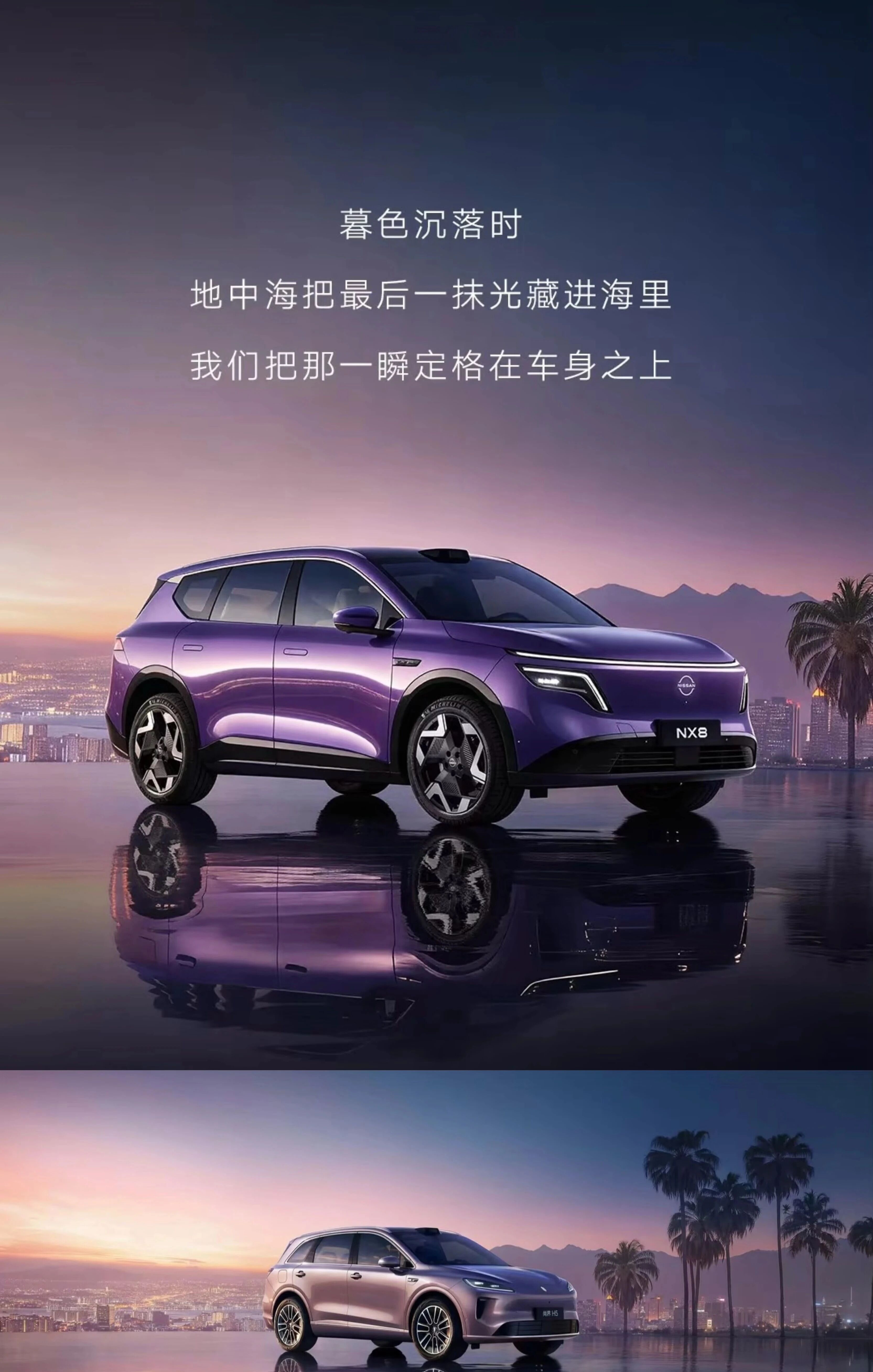 东风日产与尚界的对比图中,两张广告图均以暮色时分的滨海城市景观为背景,山脉、棕榈树、城市群落等元素都出现在了两张图片的画面内,整体色调均为暗紫色。车头朝向画面右侧,停放在水面上,车身在水面形成倒影。