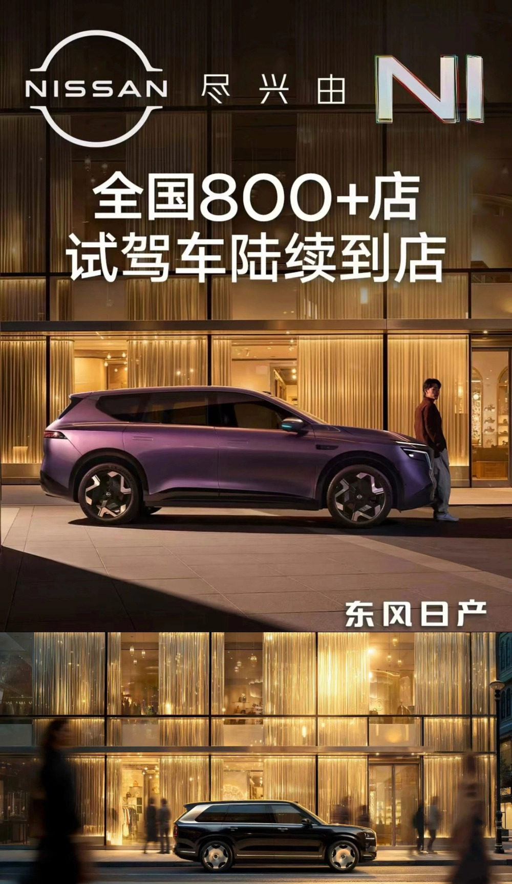 东风日产与极氪的对比图显示,两张广告图均以城市高端商业建筑为背景,建筑采用大面积玻璃幕墙和垂帘,灯光色调均为暖金色为主,整体氛围感一致。构图逻辑上,二者都采用了侧视角街景构图,车辆停放在建筑前的人行道区域。