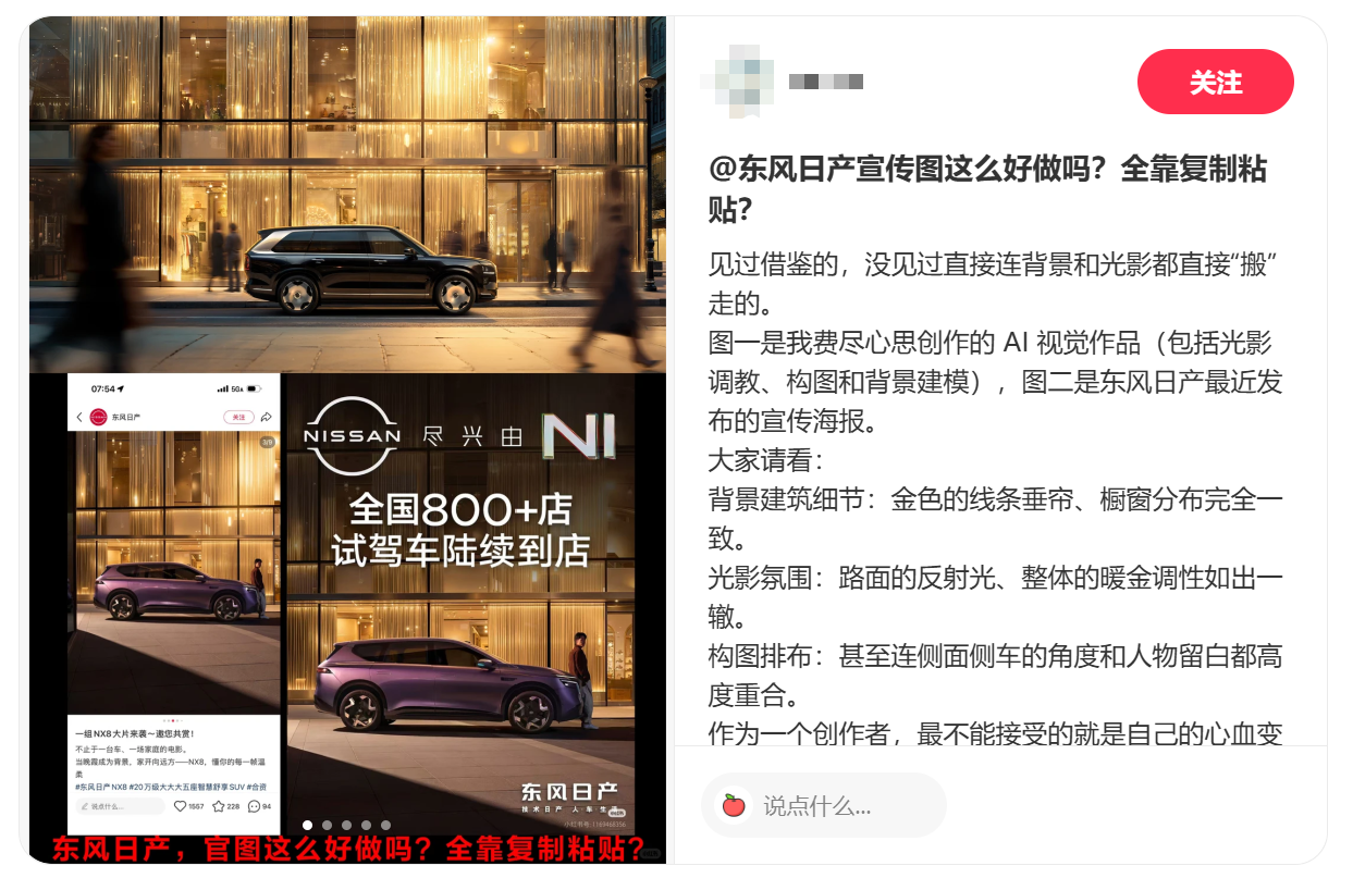 蚂蚁视觉晒出了东风日产NX8与极氪9X、尚界H5广告图的对比照,并表示,东风日产广告图的背景和光影就是直接照搬自己。