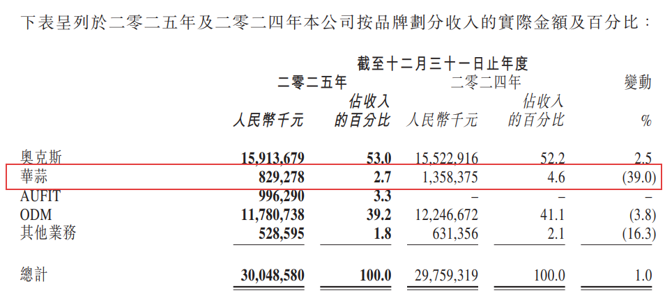 2025年,奥克斯品牌收入从2024年的155.23亿元仅小幅增长2.5%至159.14亿元;华蒜品牌收入却从13.58亿元大幅下滑39%至8.29亿元;另外,ODM业务收入下滑3.8%,其他业务收入也下滑16.3%。