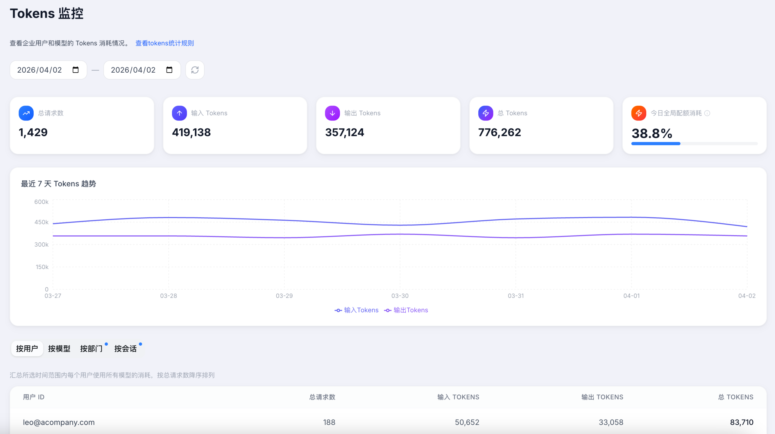 首创「企业-部门-个人」三级Token配额体系。通过多层级的可视化管理大盘,企业可实时掌握全局及各分支架构的资源消耗情况,实现配额的精准下发与用量阻断机制,从根源上杜绝预算超支风险。