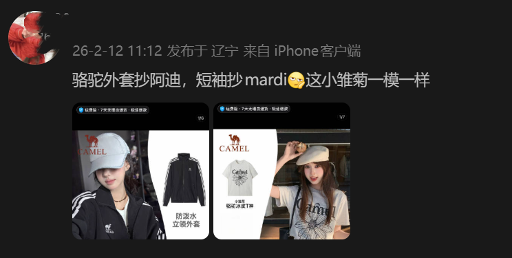 近期有关骆驼品牌被指抄袭阿迪达斯的争议主要集中在骆驼碳5K跑鞋,有网友指出该款跑鞋设计与阿迪达斯产品相似。此外,亦有声音称骆驼部分外套及短袖设计元素与其他品牌存在雷同,例如雏菊图案与Mardi款式高度相似。