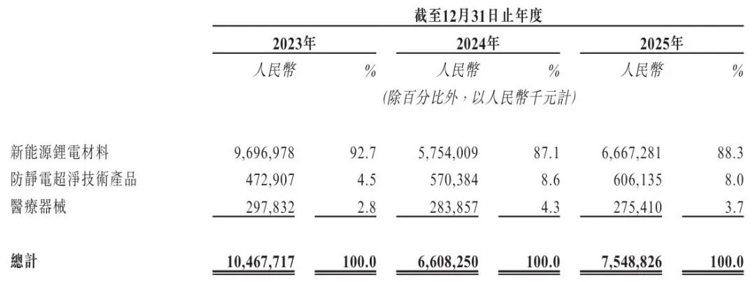 天华新能2025年来自新能源锂电材料收入66.67亿,占比88.3%;来自防静电超净技术产品收入6亿,占比8%;来自医疗器械收入2.75亿,占比为3.7%。
