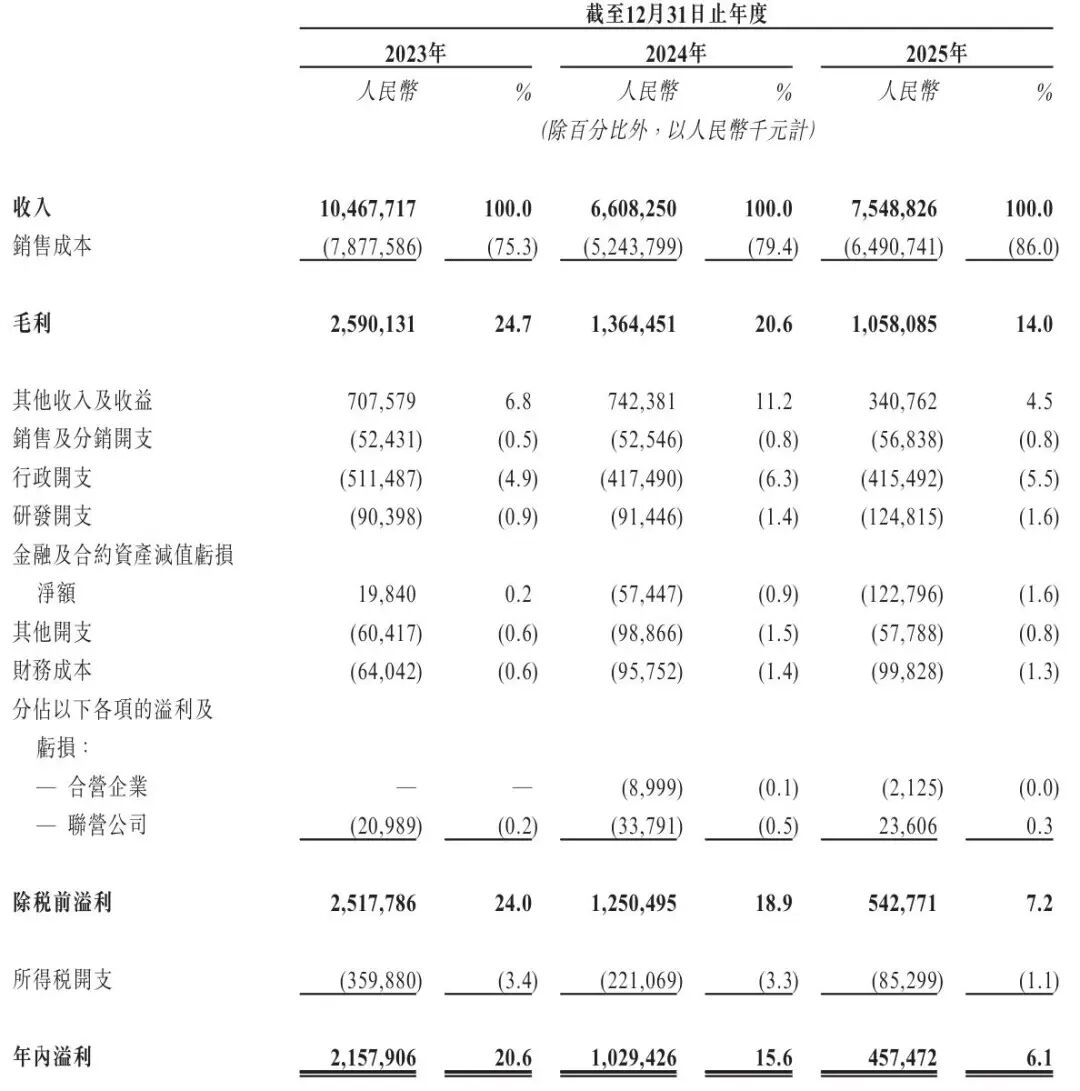 招股书显示,天华新能2023年、2024年、2025年营收分别为104.68亿、66亿、75.49亿元;毛利分别为25.9亿、13.64亿、10.58亿元,毛利率分别为24.7%、20.6%、14%。