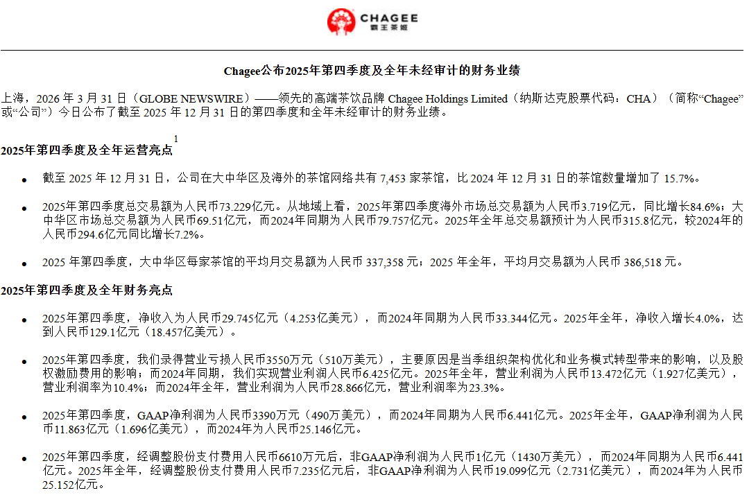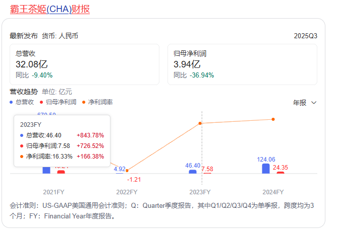 2025年全年霸王茶姬归母净利润仅11.35亿元,较上年同期腰斩过半;经调整后的净利润为19.1亿元,同比降幅超过20%。