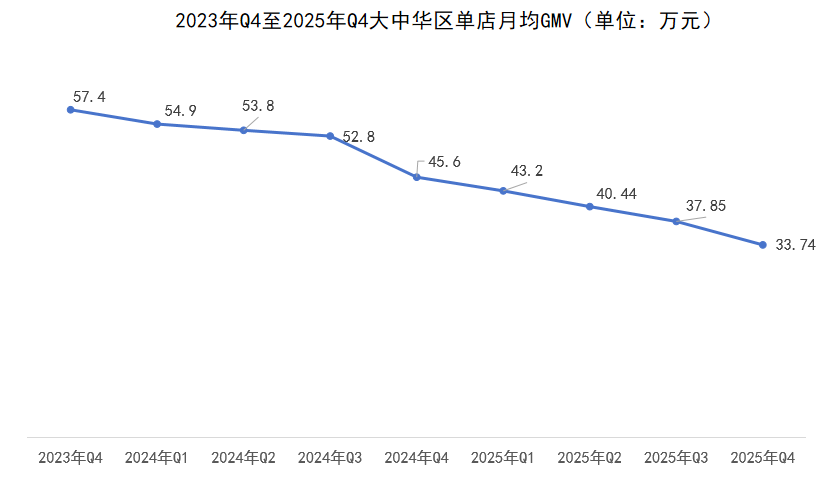 然而,这场造富神话的反转,比短剧更猝不及防:大中华区单店月均GMV从2023年Q4的57.4万元,连续8个季度下滑至2025年Q4的33.74万元,缩水幅度超四成;大单品神话破灭,新品迭代迟缓,门店无序加密持续分流客流。曾经趋之若鹜的加盟商,如今或黯然离场,或在亏损泥潭中苦苦支撑。