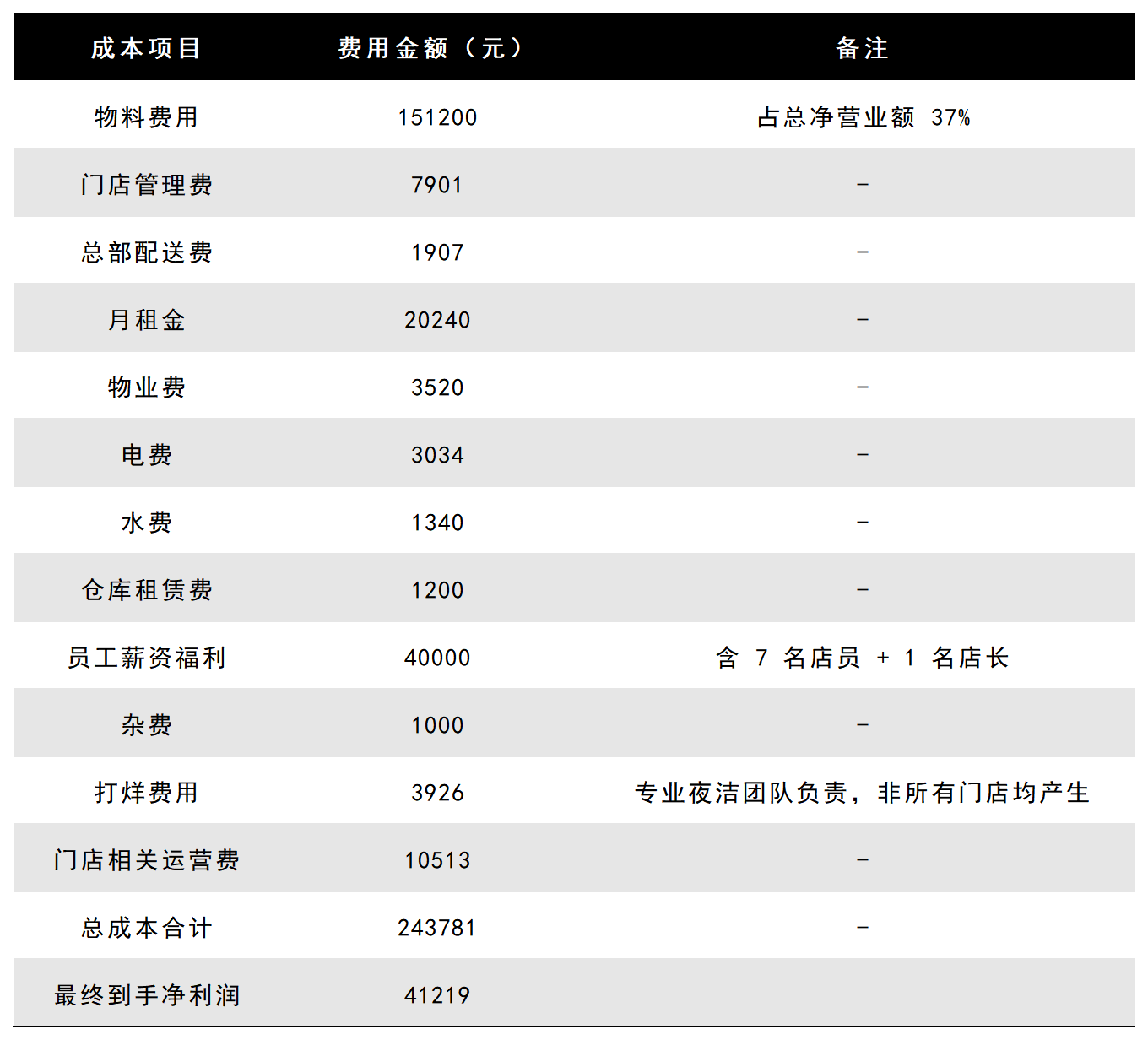 以堂食与外卖合计28.5万元的总净营业额计算,加盟商需承担的成本包括:15.12万元物料费用(霸王茶姬物料占比通常为37%)、7901元门店管理费、1907元总部配送费、20240元月租金、3520元物业费、3034元电费、1340元水费、1200元仓库租赁费、4万元员工薪资福利(含7名店员+1名店长)、1000元杂费、3926元打烊费用(由专业夜洁团队负责,员工不参与)、10513元门店相关运营费,最终到手净利润为41779元。