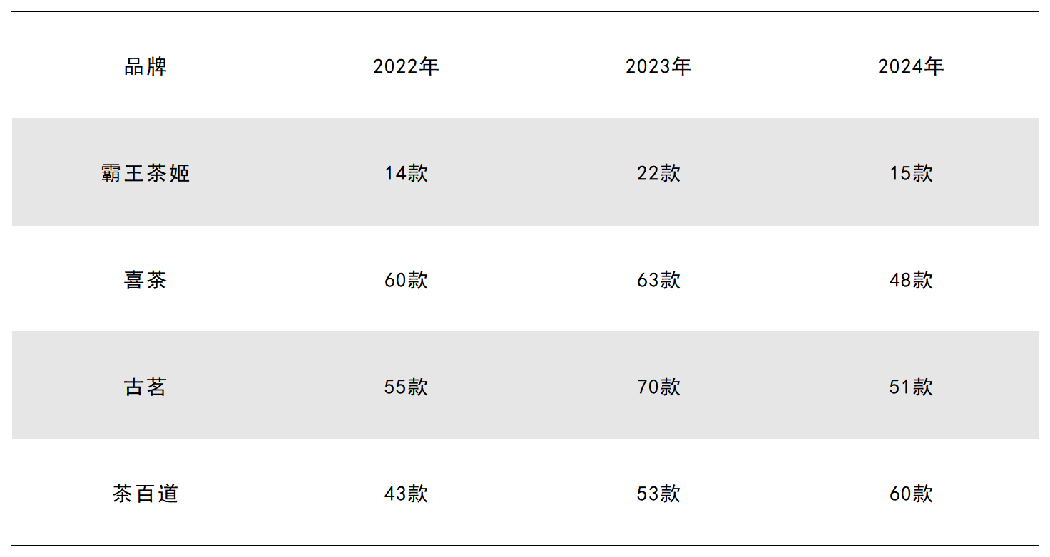 公开数据印证了加盟商的这份无奈:2025年年初至12月初,霸王茶姬在全国范围内仅上新8款产品,6月之后更是仅上新4款,其中两款还是“伯牙绝弦”的迭代版本。拉长时间周期来看,2022年至2024年,喜茶、古茗、茶百道等同行的年度上新数量,几乎是霸王茶姬的数倍之多。
