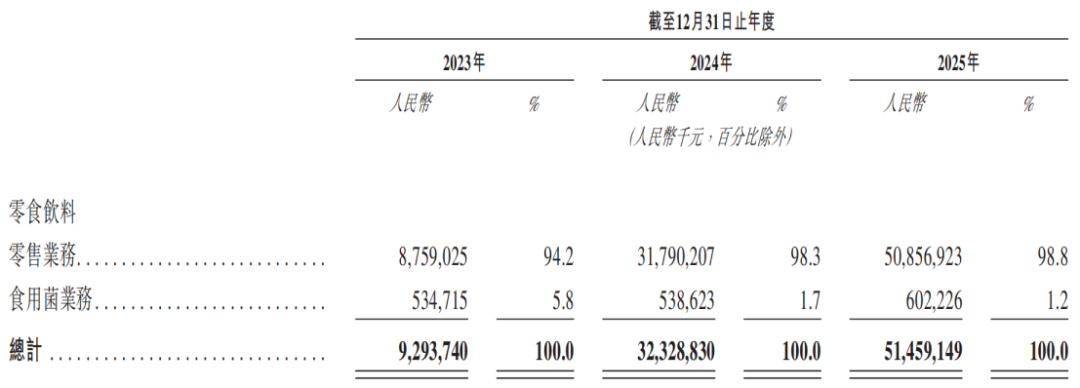 更新后的招股书显示,万辰集团的业务结构已发生根本性重塑。2025年,零食饮料零售业务收入为508.57亿元,占营收的比例高达98.8%,成为绝对的收入支柱。而曾经的核心业务食用菌业务收入占比仅为1.2%,彻底沦为边缘业务。这意味着,万辰集团已基本剥离食用菌业务,完成了从“食用菌第一股”到零食巨头的身份切换。
