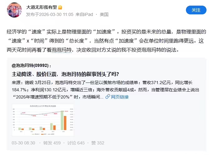 2026 年 3 月,他在社交媒体上发文:“这两天花时间再看了看泡泡玛特,决定收回我不投资泡泡玛特的说法。”