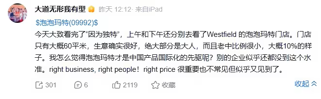 段永平表示,“今天大致看完了‘因为独特’,上午和下午还分别去看了 Westfield 的泡泡玛特门店。门店只有大概 60 平米,生意确实很好,绝大部分是大人,而且老中比例很小,大概 10% 的样子。我怎么觉得泡泡玛特才是中国产品国际化的先驱呢?别的企业似乎还都没到这个水准。right business, right people!right price 很重要也不常见但似乎又见到了。”