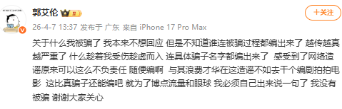 另外据知情人士透露,嫌疑人系郭艾伦身边好友,以“投资入股”为名诱导其转账近千万元。转账后,该嫌疑人一度失联,资金去向不明。目前,公安机关已正式立案,案件仍在进一步侦办中。