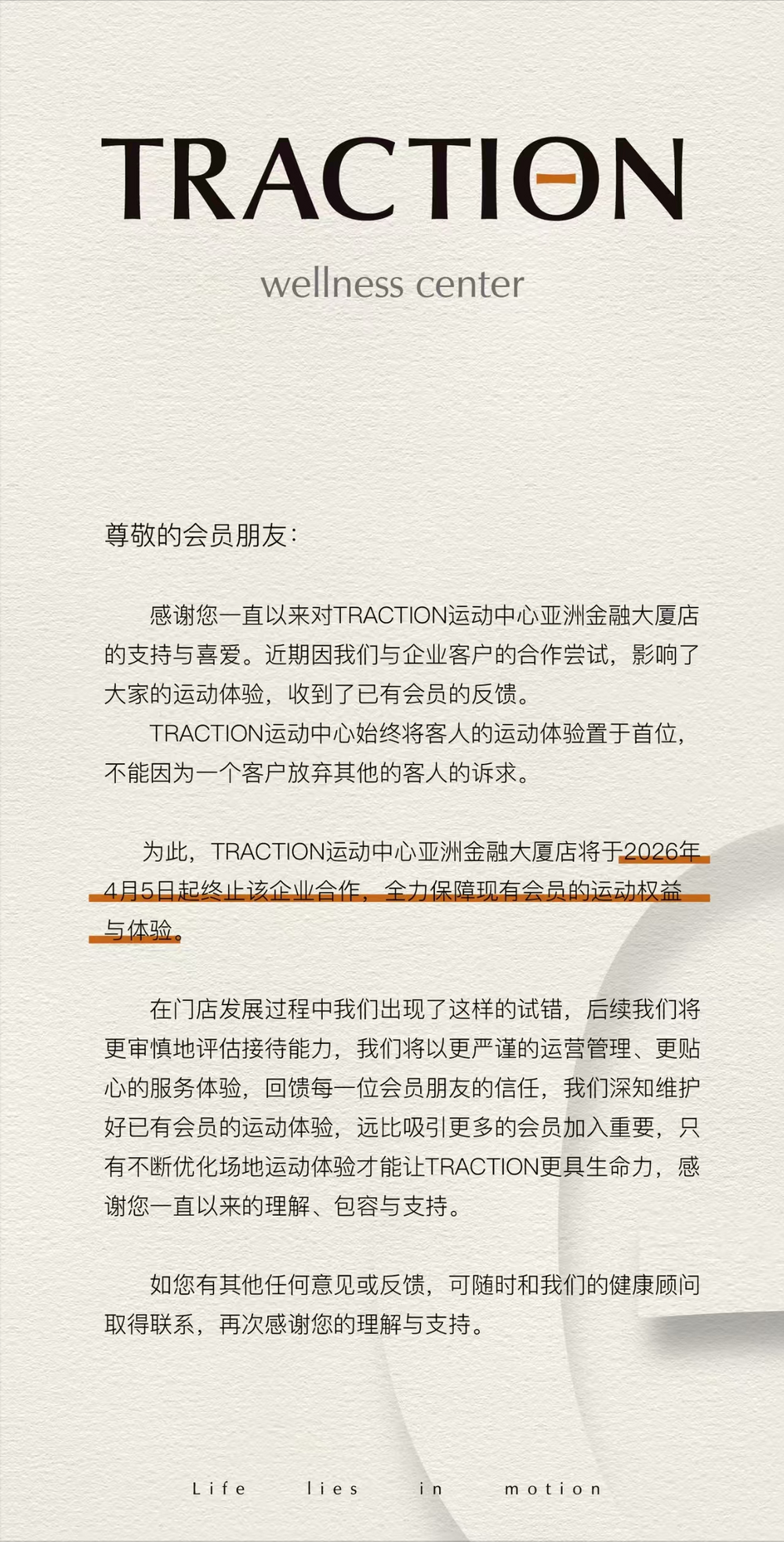 “为此,TRACTION运动中心亚洲金融大厦店将于4月5日起终止该企业合作,全力保障现有会员的运动权益与体验”。