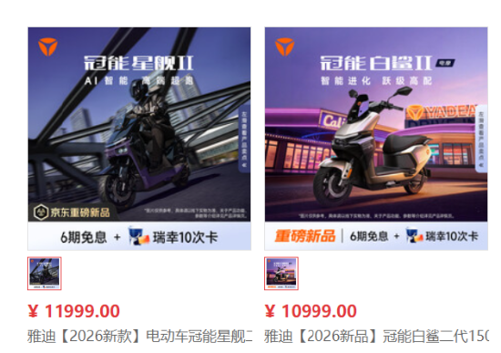 在雅迪京东官方旗舰店看到,其两轮电动车最贵卖到11999元,为2026年推出的新款雅迪冠能星舰二代150L电摩。