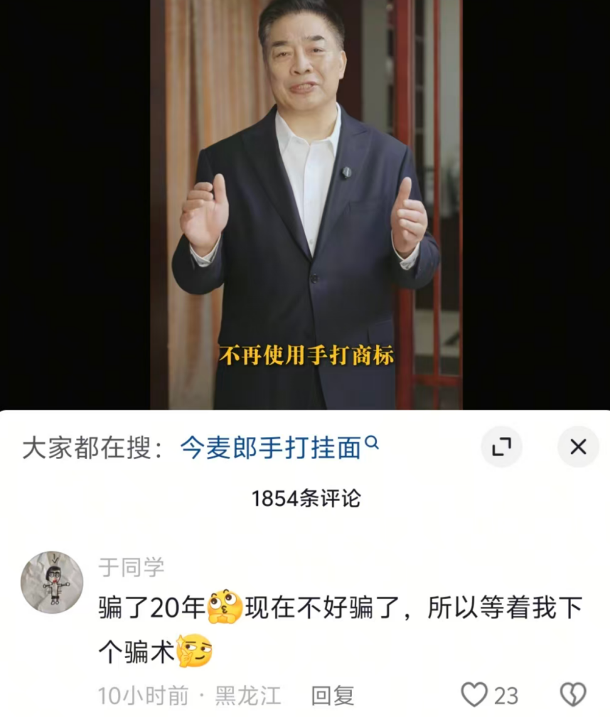 在社交媒体上,不少消费者对今麦郎使用20年“手打”商标感到不满。“骗了我们20年,品牌到今天也没有真正的道歉。”还有网友留言,“看这架势,好像大家应该给这种欺骗行为点赞似的。”