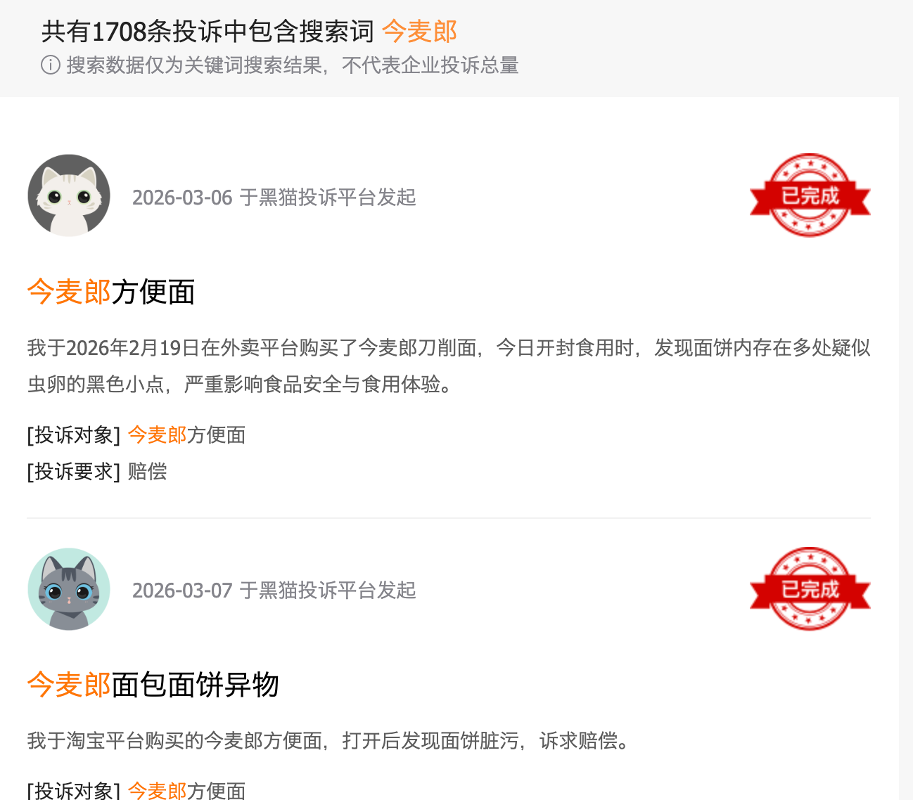 在黑猫投诉平台上,涉及今麦郎的消费者投诉高达1700多条,其中有众多消费者反映在今麦郎方便面中发现异物、产品过期、产品变质、虚假宣传等问题。