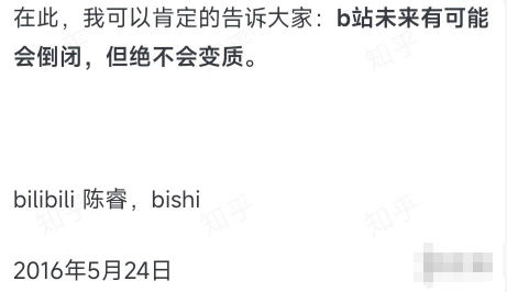 值得一提的是,2016年,B站CEO陈睿曾经发布公告称“B站未来有可能会倒闭,但绝不会变质”。