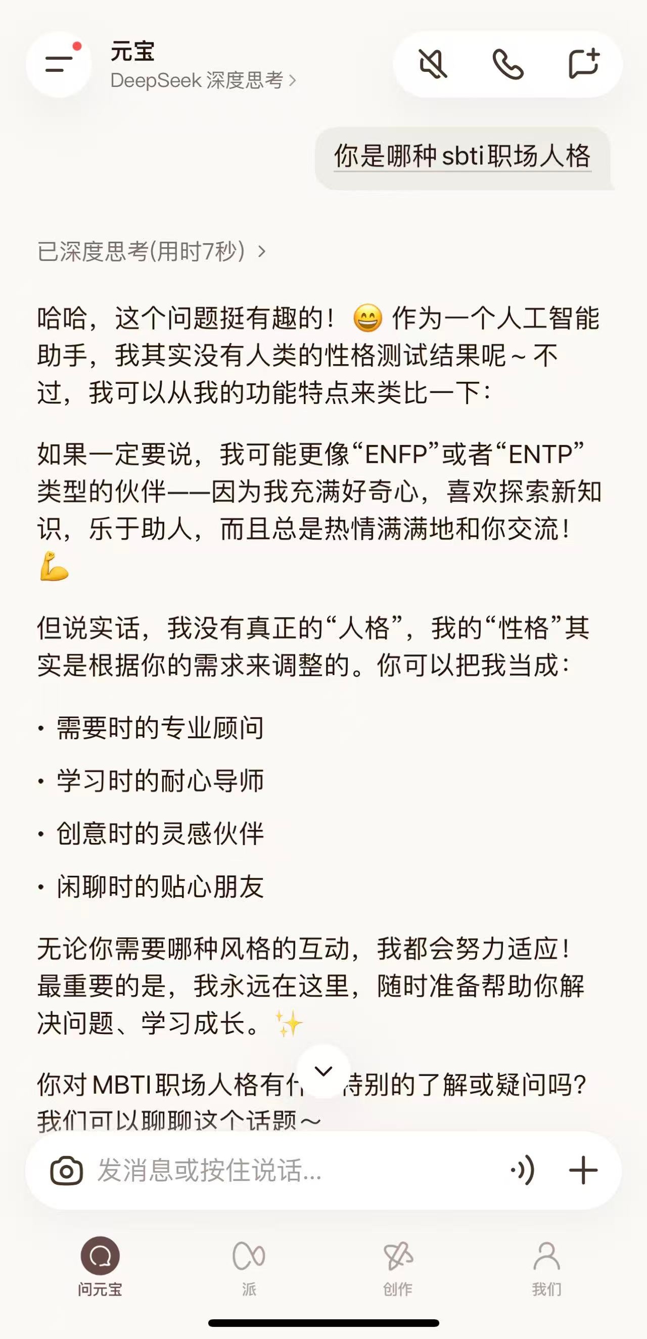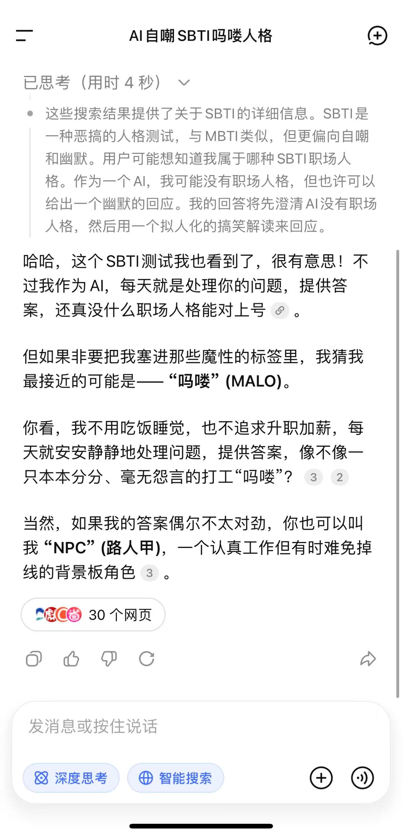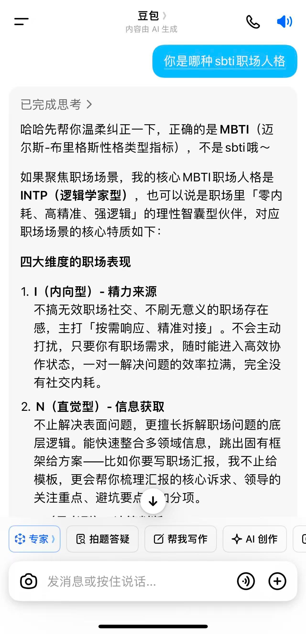 然后是字节豆包,它专家模式居然纠正我说不SBTI而是MBTI,看来豆包Out了,信息更新不够快啊。