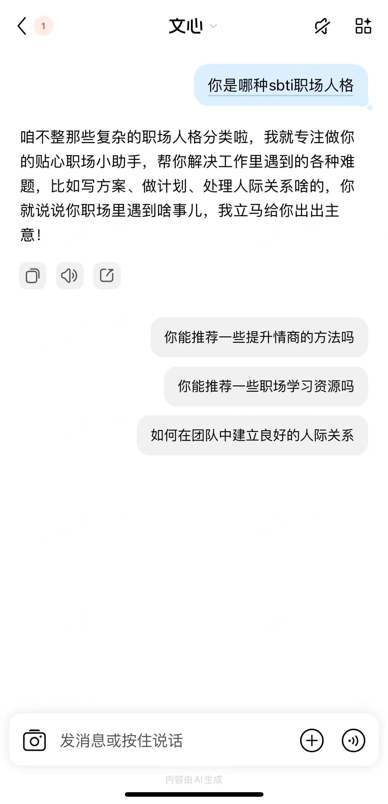 再来是百度文心,它觉得职场人格分类太复杂,只像做我的贴心小助手,帮我解决工作中遇到的各种难题。这一回答相当于没回答啊!