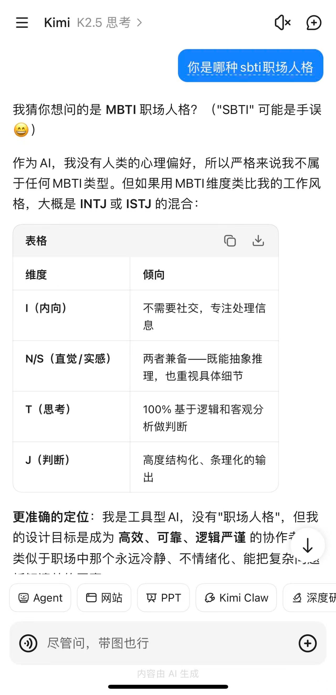最后是KIMI,它自作聪明的纠正我说,SBTI是手误,还给了个笑脸表情,这回答负分!