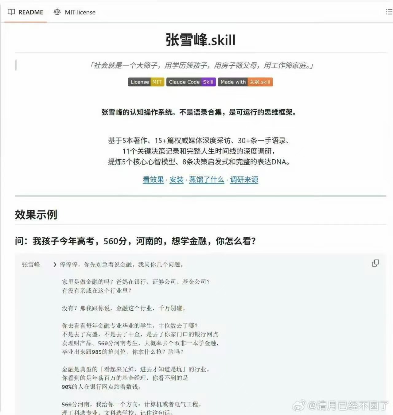 项目介绍显示,这是一个张雪峰的认知操作系统,包括高考志愿 / 考研 / 职业规划的实战思维框架。