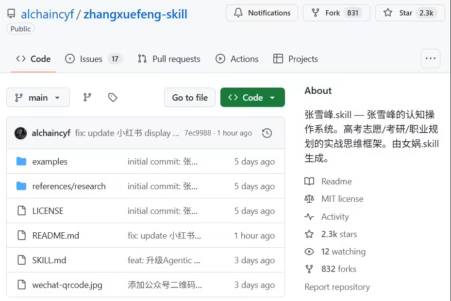 DoNews4月10日消息,近日,一款名为“张雪峰.skill”的开源项目也在 GitHub 平台上引发广泛关注与讨论,该项目已获得 2.3K Star 和 831 次 Fork。