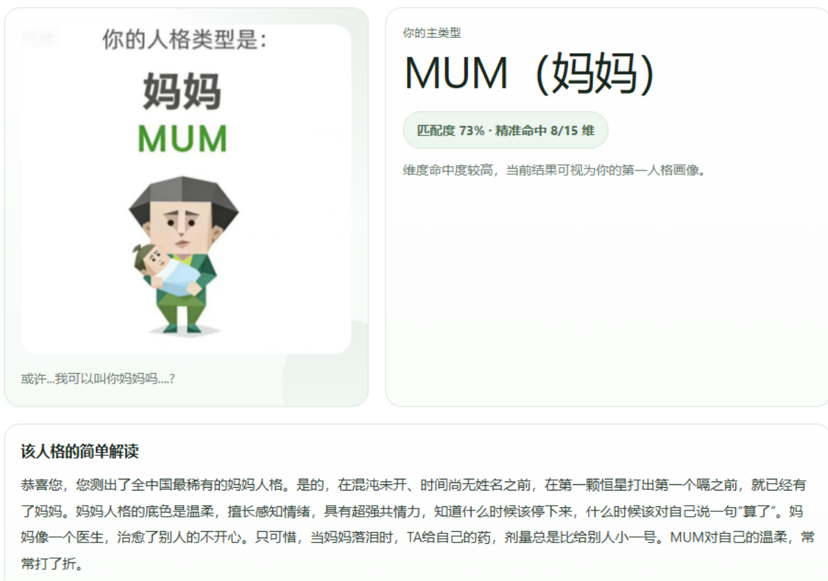如果说奇葩题目已经够让人跌破眼镜,那SBTI的测试结果更是直接刷新三观。笔者明明是男生,测出来居然是“男妈妈”。解析还一本正经写道:像医生一样治愈别人,却总忘了治愈自己,对自己的温柔永远打折扣。