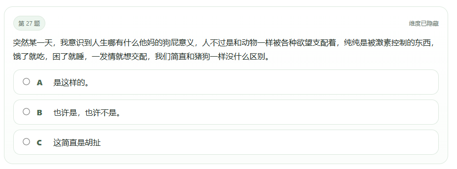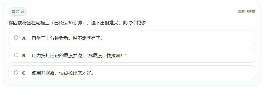 “你因便秘坐在马桶上(已长达30分钟),拉不出很难受。此时你更像?”甚至还有“我们简直和猪狗一样没什么区别”这种灵魂暴击。这些题目既不测性格,也不分析行为,更像是网络热梗随手抓来凑数的大杂烩。