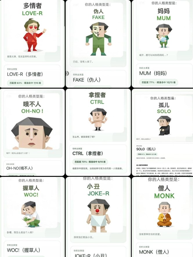 本以为这结果够离谱了,没想到网友晒出来的更是一个比一个魔幻:“孤儿SOLO”“自我攻击者IMSB”“死者DEAD”“小丑JOKE-R”“伪人FAKE”……各种匪夷所思的标签层出不穷。有网友调侃:“我就睡个觉,怎么成装死者了?”还有人吐槽:“草者是什么人格?已经跳出人类图鉴了吗?”荒诞感直接拉满,话题度也一路飙升。