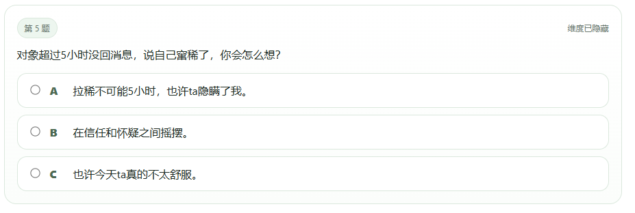 与MBTI动辄93道题、主打严肃科学的画风截然不同,SBTI的31道题走的是纯纯“发疯玩梗”路线。“对象超过5小时没回消息,说自己窜稀了,你会怎么想?”从医学角度看,人要是真连续窜稀5小时,多半已经急性肠胃炎、脱水预警,得赶紧就医了。可明明是离谱到不能再离谱的场景,SBTI居然还一本正经地给出选项。